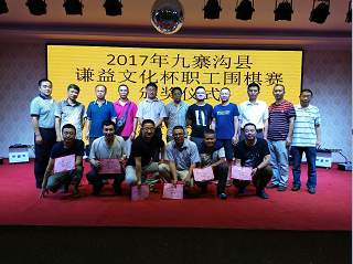 8月6日至7日,由县总工会主办的2017年九寨沟县“谦益文化杯”职工围棋比赛经过两天的角逐落下帷幕,我县职工彭刚、骆双林、阚少谦分别获得本次比赛冠军、亚军和季军。
